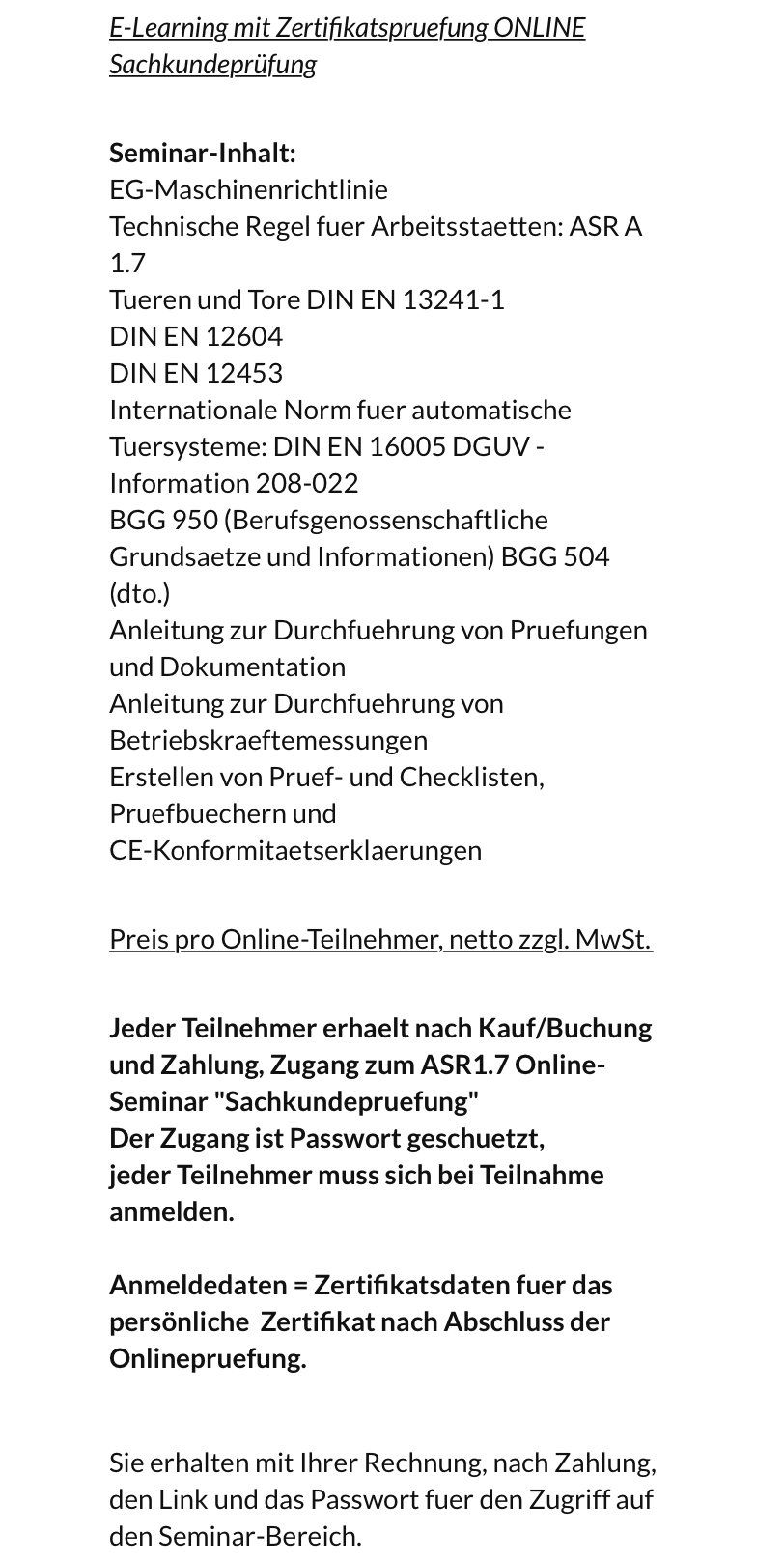 Direktbuchung und Zahlung über unseren Server, Preisstellung auf dem Server inkl. MwSt. - Zusätzlich senden wir Ihnen begleitend die Seminar Studienunterlagen mit über 400 Seiten Wissen rund um DIN, Norm und ASR1.7